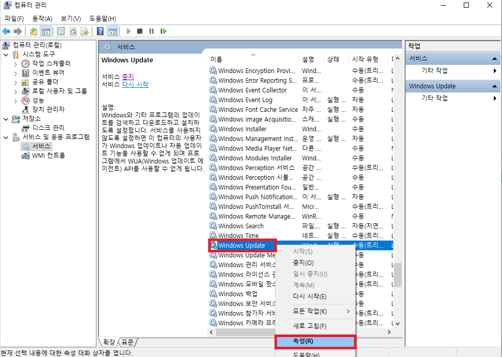 3. 서비스 목록 중 Windows Update를 찾아 마우스 우클릭 후 속성 진입