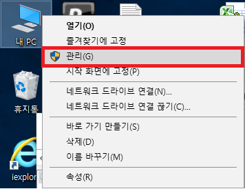 1. 바탕화면 내컴퓨터 아이콘 마우스 우클릭 -> 관리 메뉴 클릭 후 컴퓨터관리 메뉴 진입