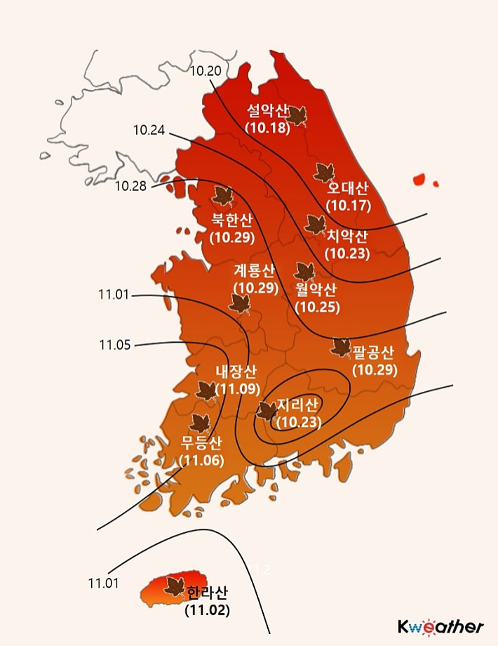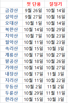 위 날짜들은 우리나라 유명한 산들의 단풍이 절정으로 피는 시기로,